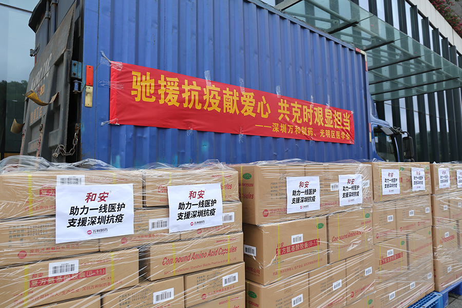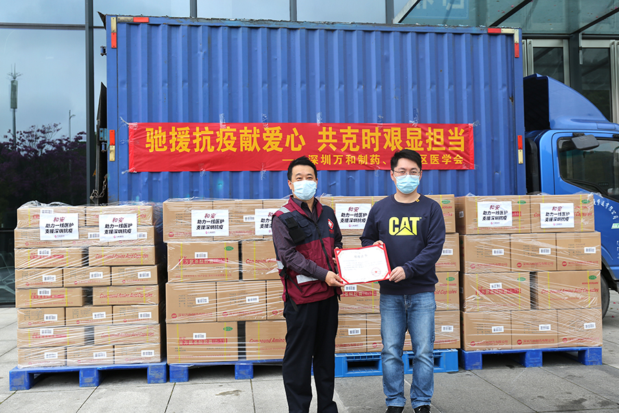 3月20日,深圳萬和制藥通過光明醫學會向工作在一線的抗疫醫護人員捐贈了100件具有抗疲勞、改善免疫力功能的和安復方氨基酸膠囊,其總價值170余萬元。萬和制藥以實際行動助力一線抗疫醫護人員,支持深圳抗疫工作。當日上午在光明區政務公共服務平臺舉行了捐贈儀式,出席儀式人員有深圳萬和制藥的代表以及光明醫學會秘書長胡建輝。胡建輝秘書長向萬和制藥代表頒發了捐贈證書。捐贈儀式結束后,萬和制藥代表隨胡建輝秘書長一起前往光明區防疫指揮部,一同把捐贈物資送到了一線流調疫議人員的手中。